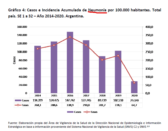 La neumonía, viral y bacteriana, también “desapareció” mágicamente en 2020. Sin duda el Sars-Cov2 no pudo desplazar a las bacterias, así que debe haber otra explicación. Probablemente sea que la neumonía agravada por el stress estaba siendo tomada como Covid. Si sumamos los muertos oficialmente por neumonía en 2020 (27.483) y los muertos por Covid según la cifra más confiable (43.243) obtenemos un total de 70.726, apenas por encima de la media de años anteriores.