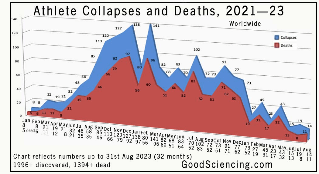 Asimismo, hubo un número alto para cualquier vacuna de afecciones cardíacas, como la miocarditis o pericarditis, afectando a una cantidad inusual de jóvenes. Esto último tal vez explique el llamativo crecimiento de descompensaciones y muertes de deportistas jóvenes en el campo de juego, que ha resultado particularmente visible y difícil de ocultar, aunque los sitios de fact-checkers se empeñan en negarlo.