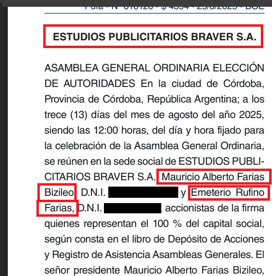 Así lo ha hecho Mauricio Farías, el hijo de Emeterio. El 2 de noviembre de 2022 registró una offshore en el distrito de Florida, Estados Unidos. Con el nombre de Suquía Contenidos LLC, en alusión a la estación de radio cordobesa. Él es el único que figura como accionista de esta offshore, del cual se desconoce su función al respecto. Se supone que sus oficinas están en la suite M4 del boulevard Biscayne al 13.499, en North Miami. El departamento pertenece a un equipo de asesores impositivos llamado L & J Accounting Inc., encabezada por la contadora Liz Jiménez.