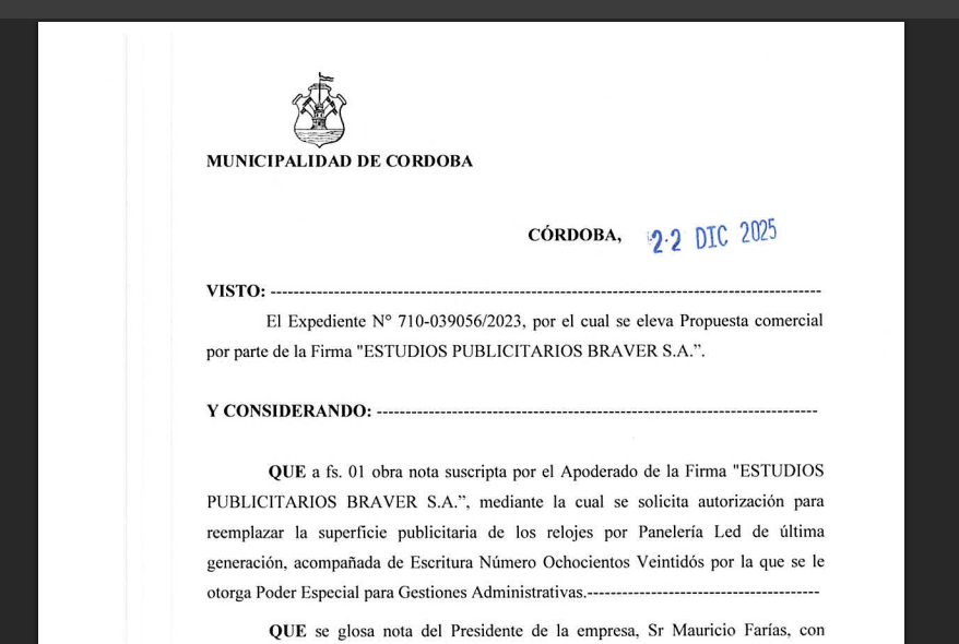 En ella se destacó que el contrato vencido de Farías / Braver le brinda una facturación de $2.300 millones al año, mediante el uso para fines publicitarios de 104 paradas de colectivo con dos paletas ($260 millones), 35 relojes digitales ($108 millones); 24 pantallas LED ($600 mil) y cerramientos de chapa de obras o terrenos ($792 millones). Todo, sin la retribución correspondiente a la Municipalidad de Córdoba y cargando con 78 juicios por el no pago de multas.
