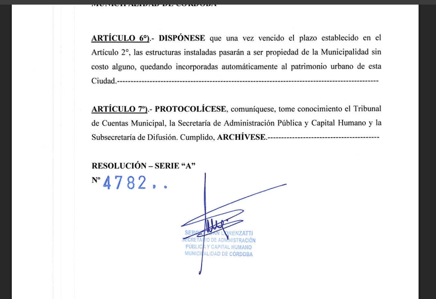 El plazo de vigencia es de dos años, y puede extenderse por otros dos más. Como contrapartida, la Municipalidad de Córdoba recibe un canon en especies, consistente “en el uso exclusivo, en forma gratuita y durante el plazo de vigencia” de esas mismas pantallas para lanzar “campañas de comunicación institucional, promoción turística y difusión de actividades y mensajes de bien público, a sólo requerimiento de la Subsecretaría de Difusión y su correspondiente manutención”.