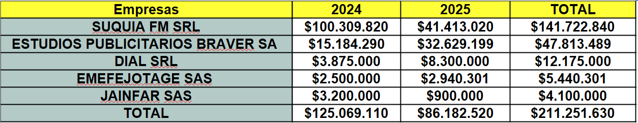 Después, en menor medida, aparece la firma Dial SRL de los Farias, también dedicada al servicio radiofónico, que recibió $12 millones en la era llaryorista. Le sigue Emefejotage SAS, con $5,4 millones, creada recientemente por Mauricio Farías y otro socio. Que se dedica a actividades de distintos rubros, como la construcción, el transporte, el arrendamiento, etc. Según el Portal de Transparencia, los fondos provinieron de la Defensoría del Pueblo para la “publicidad y difusión de actos de gobierno”.