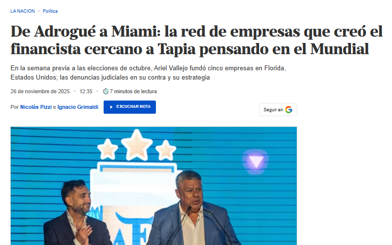 El que “casualmente”, es el mismo domicilio donde el asesor financiero de “Chiqui” Tapia, Ariel Vallejo, creó cinco offshores, previo a las elecciones legislativas de octubre del año pasado. Se trata de Sur Finanzas Company Florida (fundada el 10 de octubre de 2025), Sur Finanzas Real Estate (22 de octubre), Sur Car Miami Beach, Sur Inversiones Miami, Sur Store Beach y Sur Grill Miami (estas últimas el 24 de octubre).