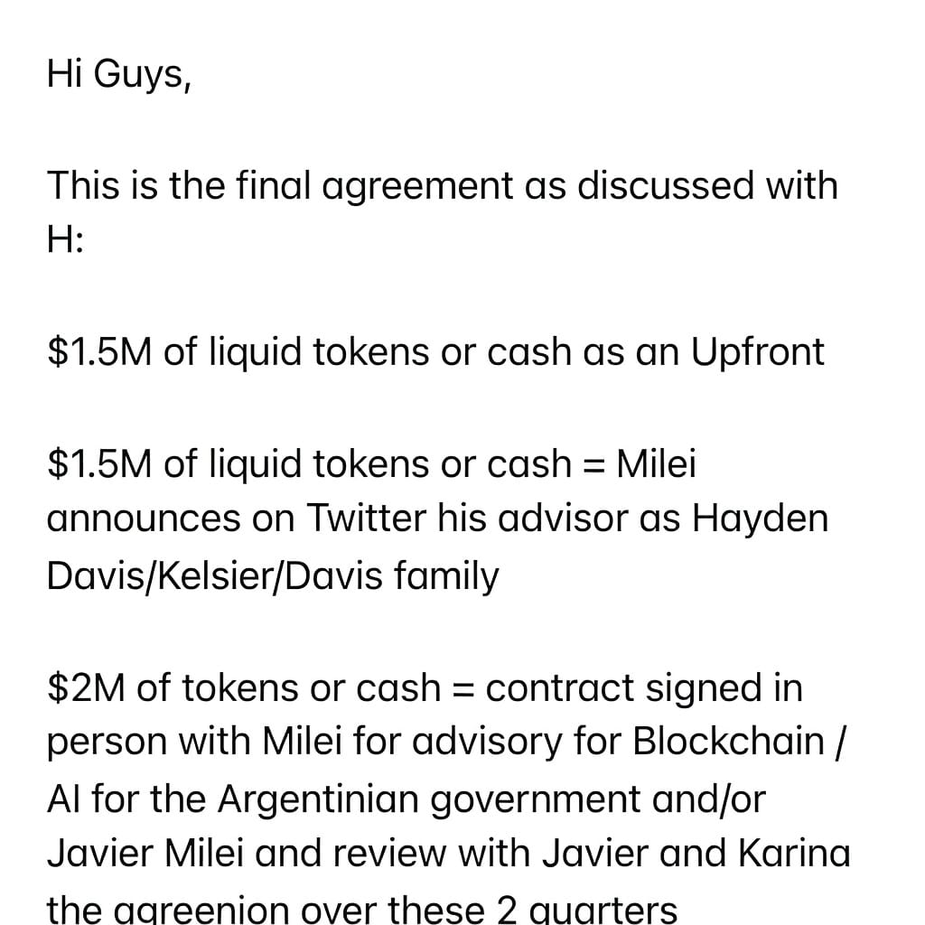 El memo encontrado en el celular de Novelli, creado tres días antes de que Milei publicara el link al contrato de $LIBRA en X, detalla un esquema de pagos por un total de cinco millones de dólares. En un primer tramo, alguien identificado como H (el norteamericano Hayden Davis, según el expediente) pagaría un millón y medio de dólares en concepto de adelanto, en tokens líquidos o efectivo, a Novelli. Luego, otro millón y medio, condicionado a que Milei anunciara en X que Davis y su empresa Kelsier Ventures eran sus asesores en materia cripto. Y finalmente dos millones adicionales contra la firma de un contrato de asesoría en persona, con revisión explícita de «Javier y Karina».