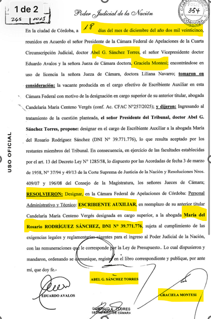 El 18 de diciembre de 2025, Abel Sánchez Torres convocó al camarista Eduardo Ávalos, justo cuando la integrante de esa cámara Liliana Navarro había tomado licencia, para considerar el nombramiento de una escribiente auxiliar a los efectos de cubrir el cargo de escribiente auxiliar ocupado por una empleada recientemente ascendida.
