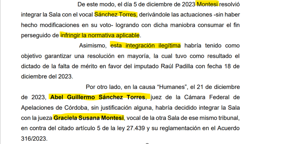 Mientras que en la causa “Humanes”, el 21 de diciembre de 2023, Sánchez Torres decidió integrar amorosamente a su pareja Montesi, vocal de la otra Sala de ese mismo tribunal, en contra del Acuerdo 316/2023. Para eso, le habría ordenado a la secretaria Celina Laje Anaya, la confección de un certificado a los fines de dejar constancia que la Sala se integraría con él y su pareja Graciela Montesi. Ante la negativa de la secretaria, se frustró el plan de Sánchez Torres de fallar en tándem con Montesi en la causa Humanes.