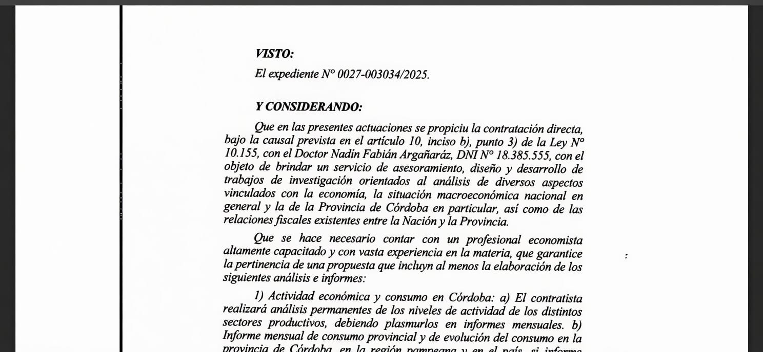El año pasado, en medio del ajuste desatado por la Nación, que impactó de lleno en la Coparticipación federal que reciben las provincias, el Estado cordobés le pagó a Nadin Argañaraz $ 35.691.376 en concepto de asesoramiento para el “Diseño y desarrollo de trabajos de investigación que aborden distintos aspectos vinculados con la economía, el estudio de la situación macroeconómica nacional en general y de la Provincia de Córdoba en particular. y de las relaciones fiscales existentes entre la Nación y la Provincia”.