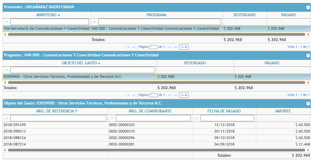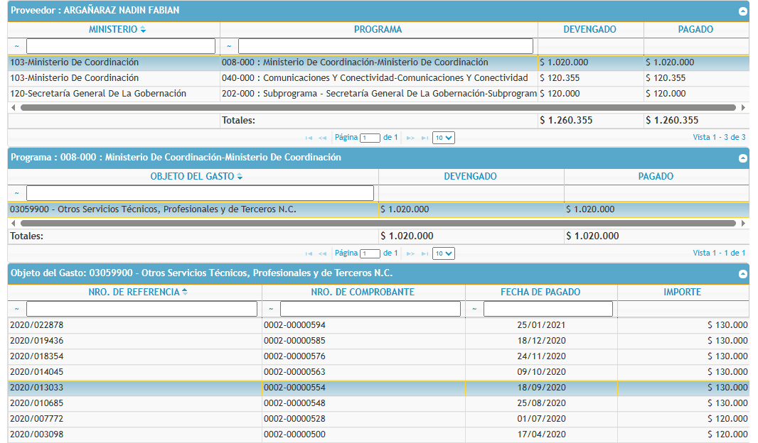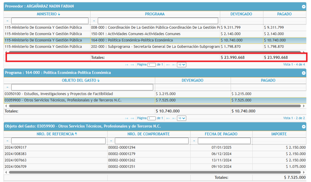 Esta vez, el contrato estuvo a cargo de la Secretaría General de la Gobernación, con un único pago de $ 120 mil para “brindar análisis sobre la situación macroeconómica”. El resto fue acordado por el Ministerio de Coordinación a cargo de Silvina Rivero. Para comienzos del año, recibió otro monto de $ 120 mil, cuya única justificación fue “para atender pago monotributista” (sic). A partir de abril, Argañaraz recibió honorarios de entre $ 120 mil y $ 130 mil por “servicio de consultoría en materia de economía”; totalizando el millón de pesos.