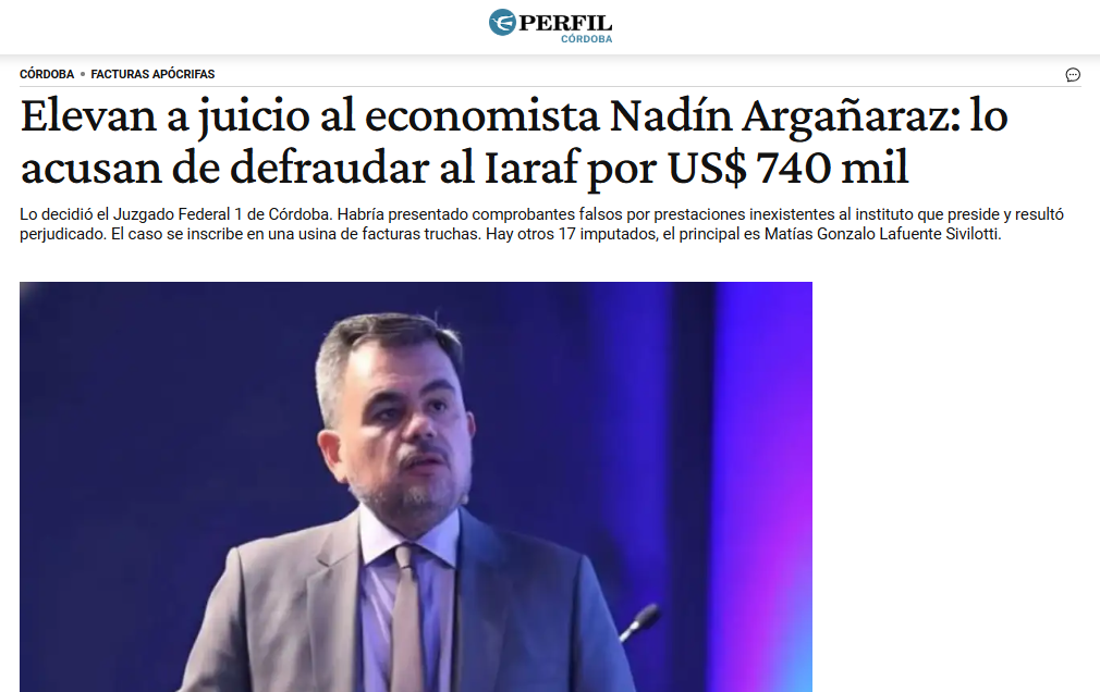 Los economistas de todo el país a comienzo de mes esperan ansiosos los informes del IARAF, Instituto Argentino de Análisis Fiscal, dirigido por Nadin Argañaraz. Un notable economista liberal dedicado al análisis de la problemática tributaria, fiscal, y presupuestaria argentina. Pero además de estar procesado por graves delitos de evasión tributaria, Nadin Fabián Argañaraz extrajo de los presupuestos del Estado de la provincia de Córdoba en los últimos años, un monto equivalente a U$S 176 mil a valores oficiales.