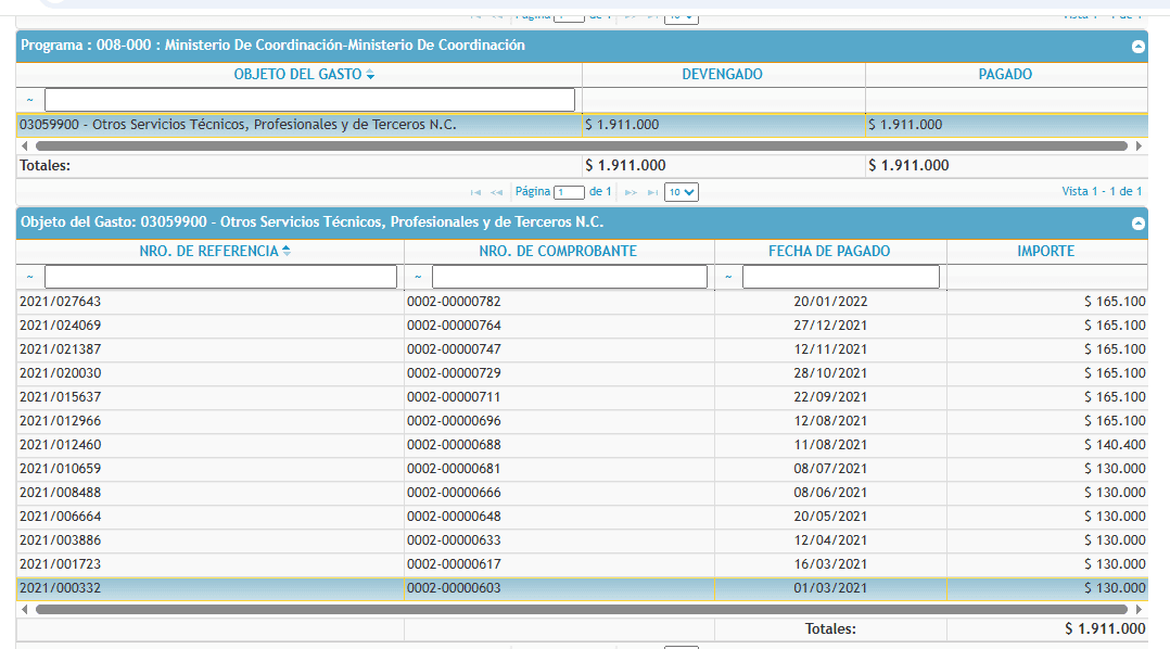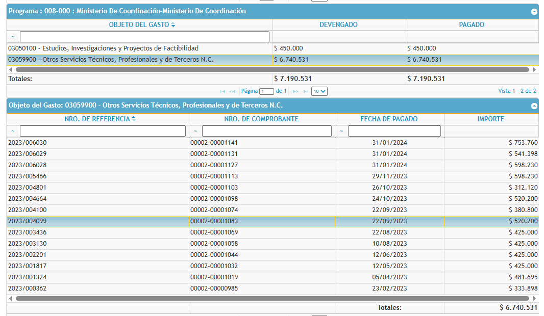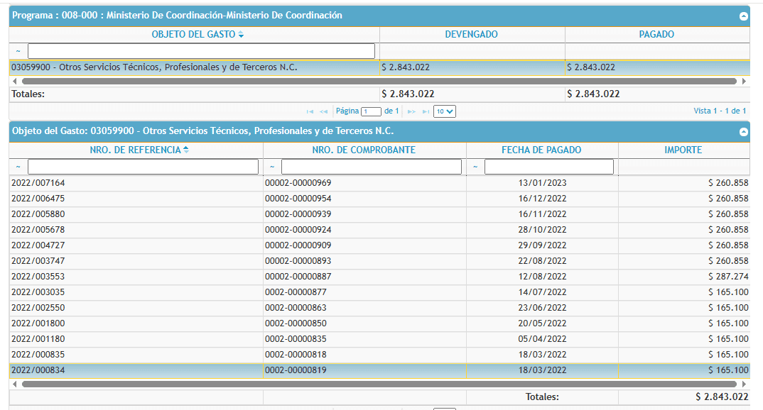 En el año siguiente, 2022, repitió el mismo procedimiento con el mismo Ministerio de Coordinación, pero ese año logró cobrar unos $ 2.843.022, US$ 23 mil a valores oficiales, por “servicio de consultoría”. Empezó con honorarios de $165 mil y llegó a $ 260 mil.