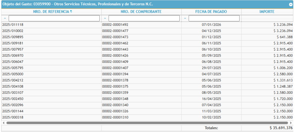 En el contrato se especifica que el plazo de esta contratación es de ocho meses, con posibilidad de una prórroga para el mismo período, con una suma de $ 3,5 millones por mes, con IVA incluido. Precisamente, en los tramos finales de sus últimas remuneraciones, según se puede contemplar en la última planilla extraída del Portal de Transparencia, los montos son acordes a lo pautado en esta documentación firmada en octubre de 2025.
